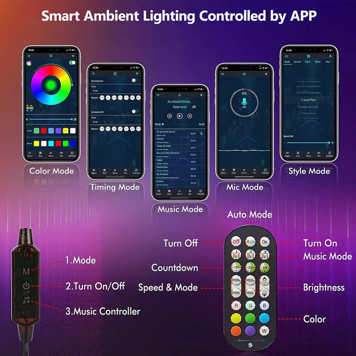 - Bluetooth App Control: Easily adjust colors, brightness, and lighting modes using a user-friendly mobile app, allowing full customization to match your mood or activity.