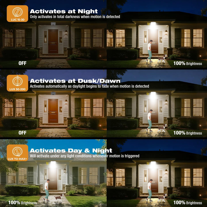 Dusk/Dawn Mode (50 LUX): Turns on automatically as daylight fades when movement is detected.