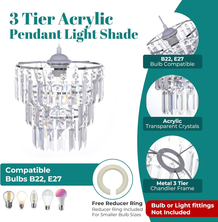 The universal fitting makes installation effortless — simply attach it to any standard bulb holder (E27, E14, or B22 with the included reducer ring). No wiring required. Designed for convenience and sophistication, this 3-tier chandelier lampshade is the perfect way to transform everyday lighting into a statement feature.