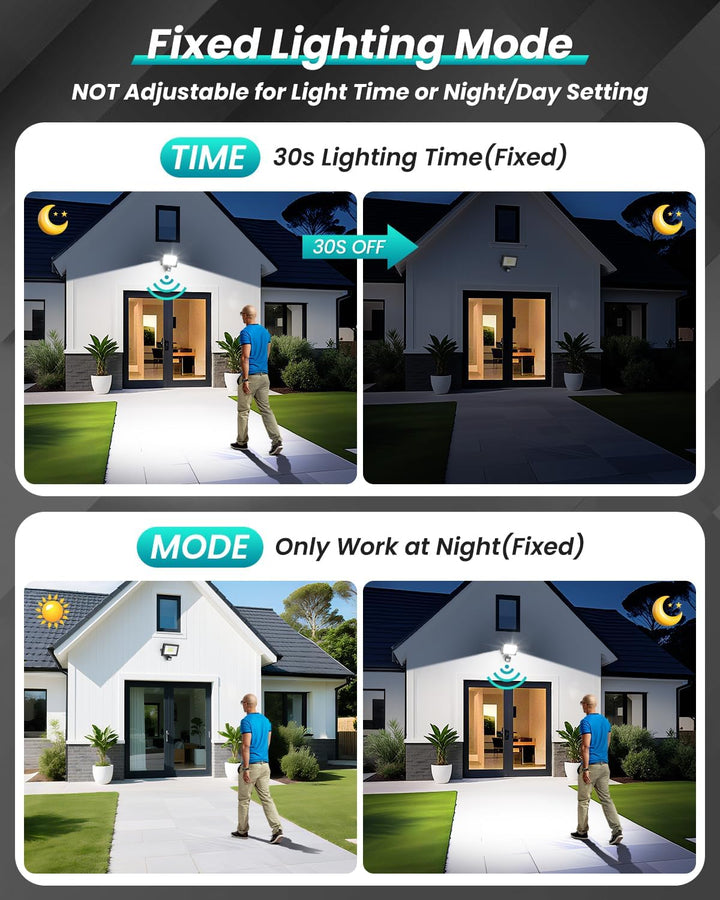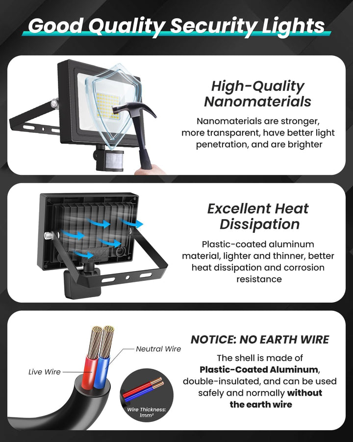The innovative NO EARTH WIRE design offers double-layer electrical safety, featuring a plastic-coated aluminum shell that prevents current leakage while ensuring efficient heat dissipation. With a simple, adjustment-free sensor, this light automatically activates at night when motion is detected up to 12 meters away, staying on for 30 seconds per activation.