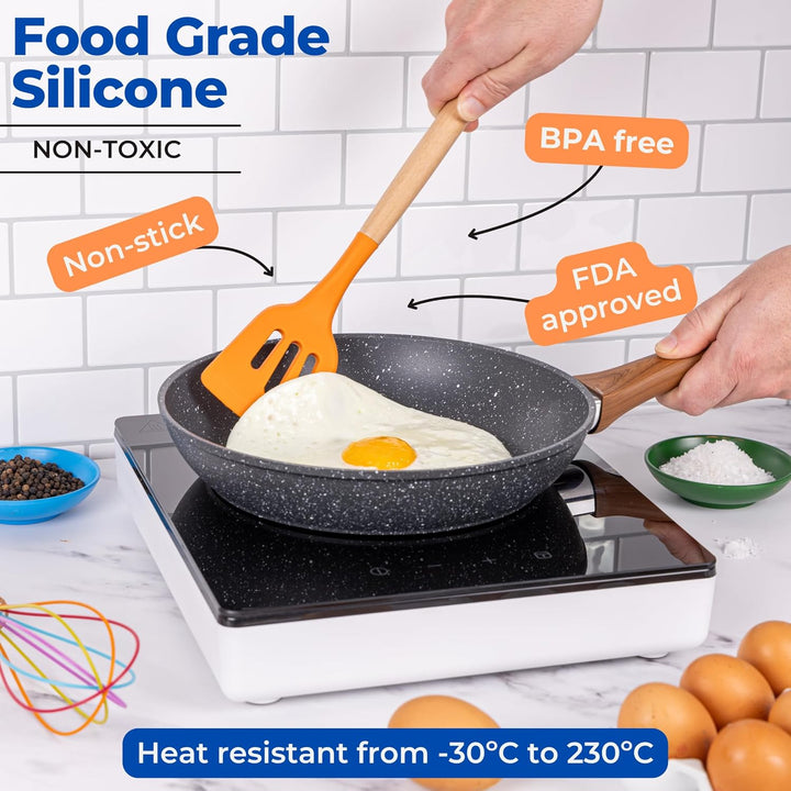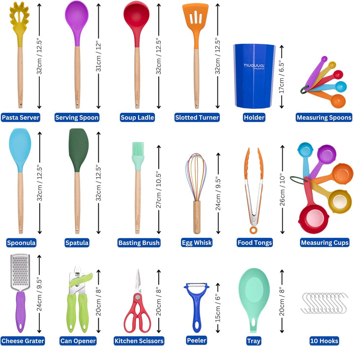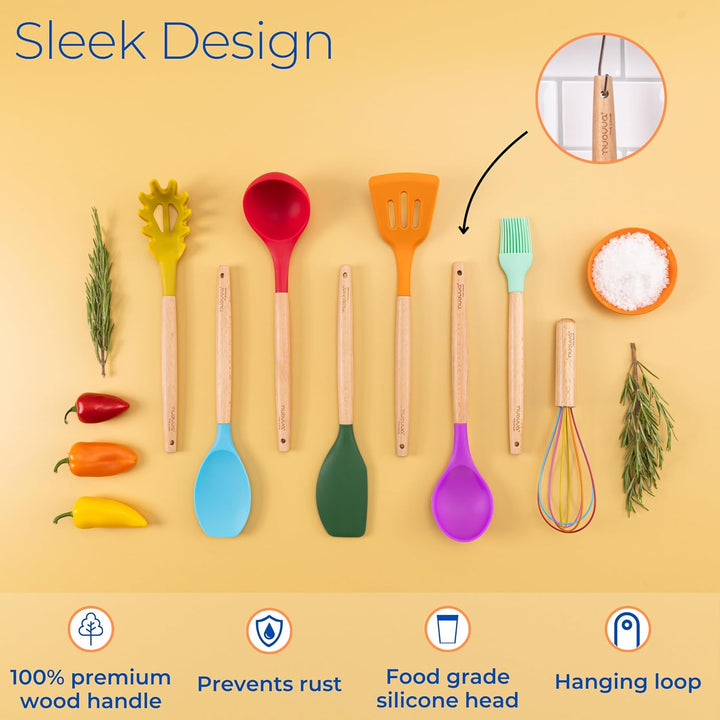 This comprehensive set includes ladles, spoons, spatulas, tongs, and other essential kitchen tools, covering all your cooking needs from stirring and serving to flipping and scraping. The colorful silicone heads make it easy to organize and add a fun, vibrant look to your kitchen.
