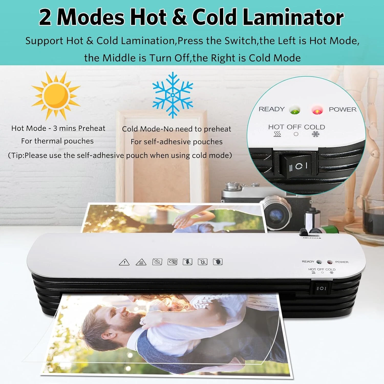 Dual Laminating Modes: Choose between hot and cold laminating modes to suit different types of documents and pouches.