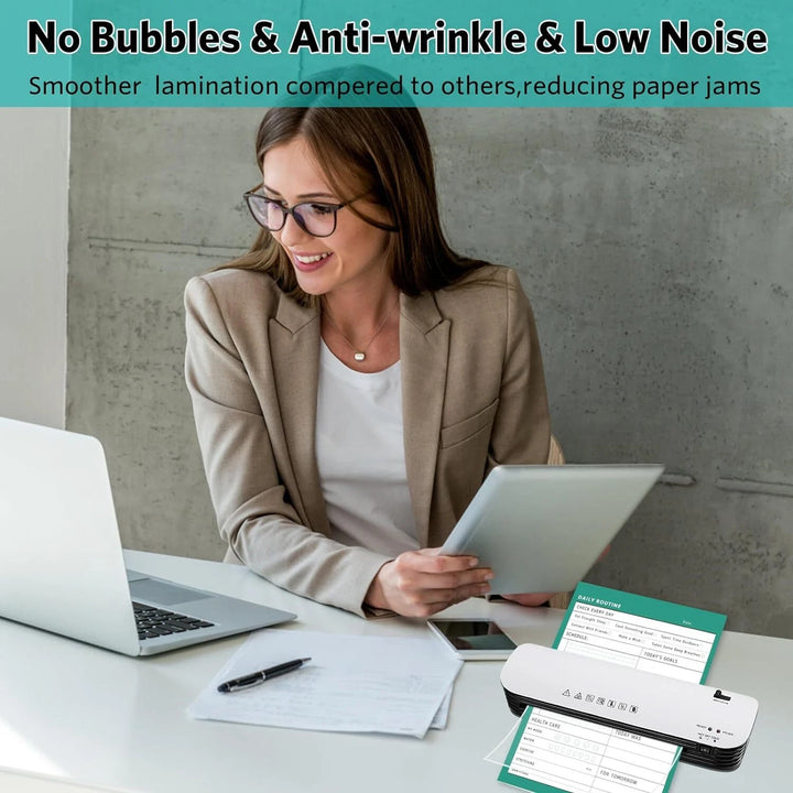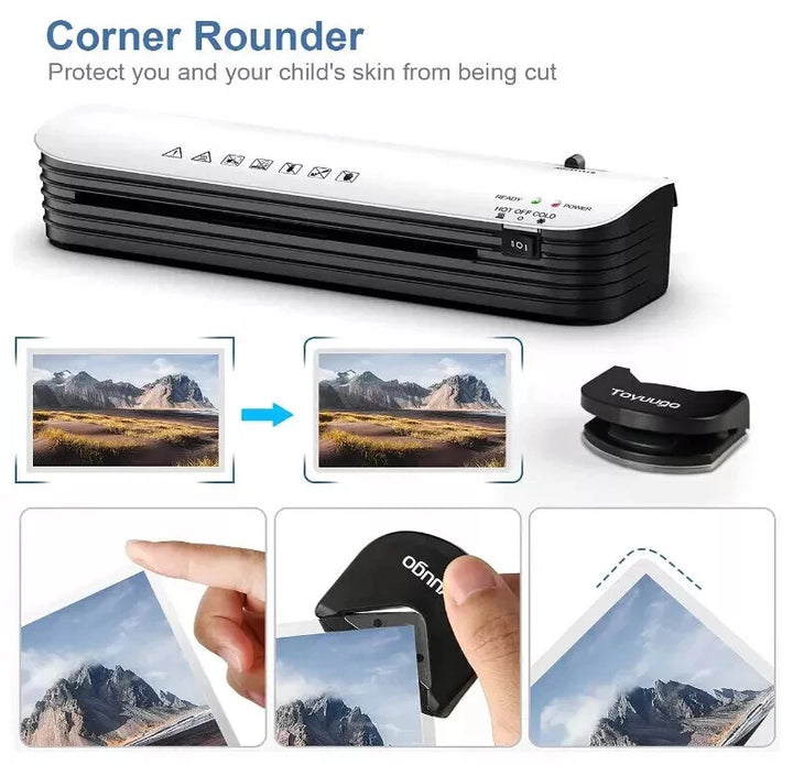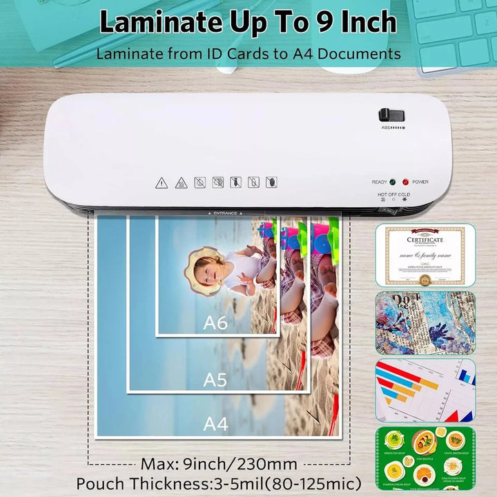 Compact and Versatile: This personal laminator has a 9-inch (A4 size) entry and is compatible with various pouch thicknesses and paper sizes (A4, A5, A6).