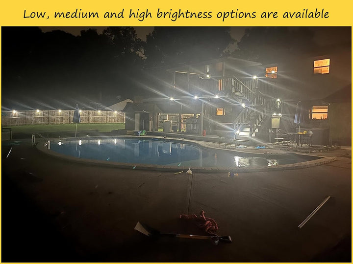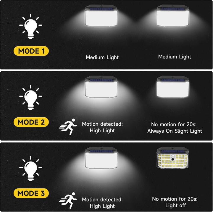 Each solar light is equipped with an 1800mAh rechargeable battery and a high-efficiency solar panel with a 20% conversion rate, ensuring fast charging and 10–12 hours of continuous lighting after just 6–8 hours of sunlight. Designed with 3 intelligent lighting modes, you can choose between constant medium light, dim-to-bright motion mode, or off-to-bright motion mode for maximum flexibility.