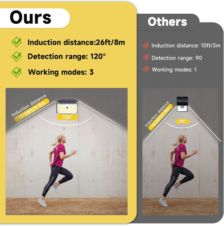 Built with durable IP65 waterproof housing, these solar wall lights are resistant to rain, snow, and heat — making them perfect for gardens, garages, fences, patios, driveways, and pathways. The PIR motion sensor detects movement up to 26 feet (8 meters) within a 120° range, offering reliable illumination and enhanced security throughout the night.