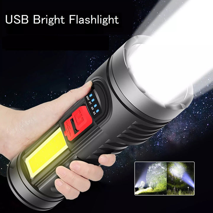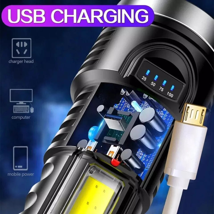 This USB rechargeable flashlight comes with a high-capacity battery, ensuring extended usage time on a single charge. The built-in power indicator lets you monitor battery levels, so you're never caught off guard. Easily recharge via USB cable, making it a convenient, eco-friendly, and cost-effective lighting solution.