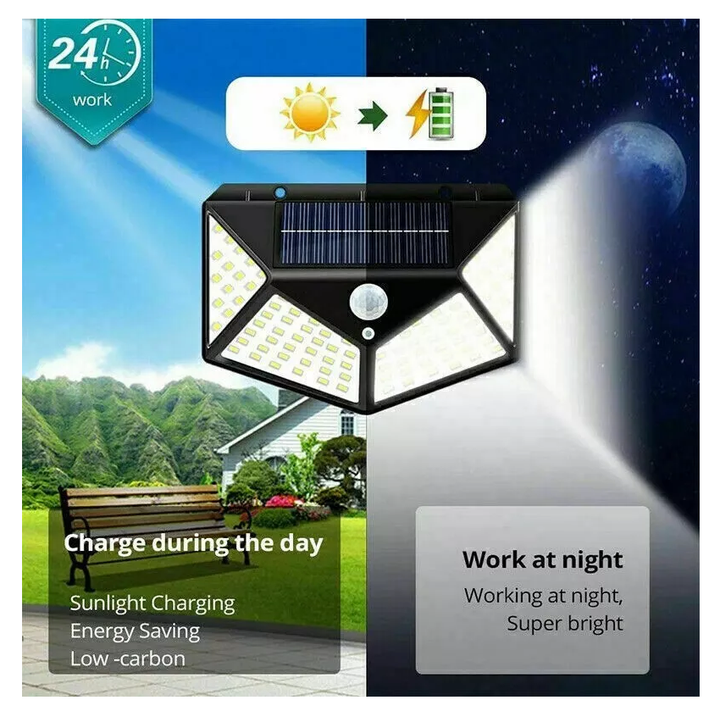 Illuminate your outdoor spaces with the 4X Solar Power PIR Motion Sensor Wall Lights, designed to offer bright, energy-efficient lighting while enhancing the security of your property. Equipped with 100 ultra-bright LEDs and motion sensor technology, these solar-powered lights automatically turn on when they detect movement, making them perfect for your garden, driveway, patio, walkway, or garage. Easy to install and eco-friendly, they provide reliable lighting without the need for electrical wiring, offering both convenience and safety.