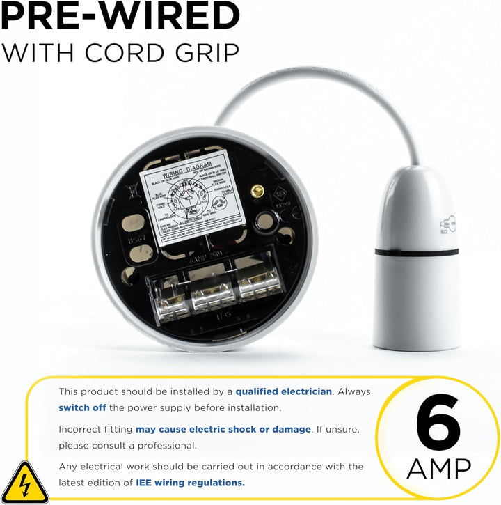 Pre-wired with a secure T2-rated cord grip, this fitting ensures quick and safe setup with no need for special tools. Suitable for standard 220–250V UK mains voltage and supporting bulbs up to 100W, it provides both reliability and performance.