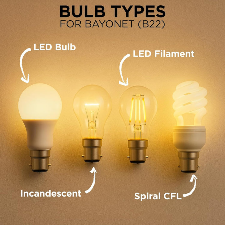 B22 Bayonet Bulb Holder: Compatible with a variety of B22 bulbs (LED, CFL, or filament).