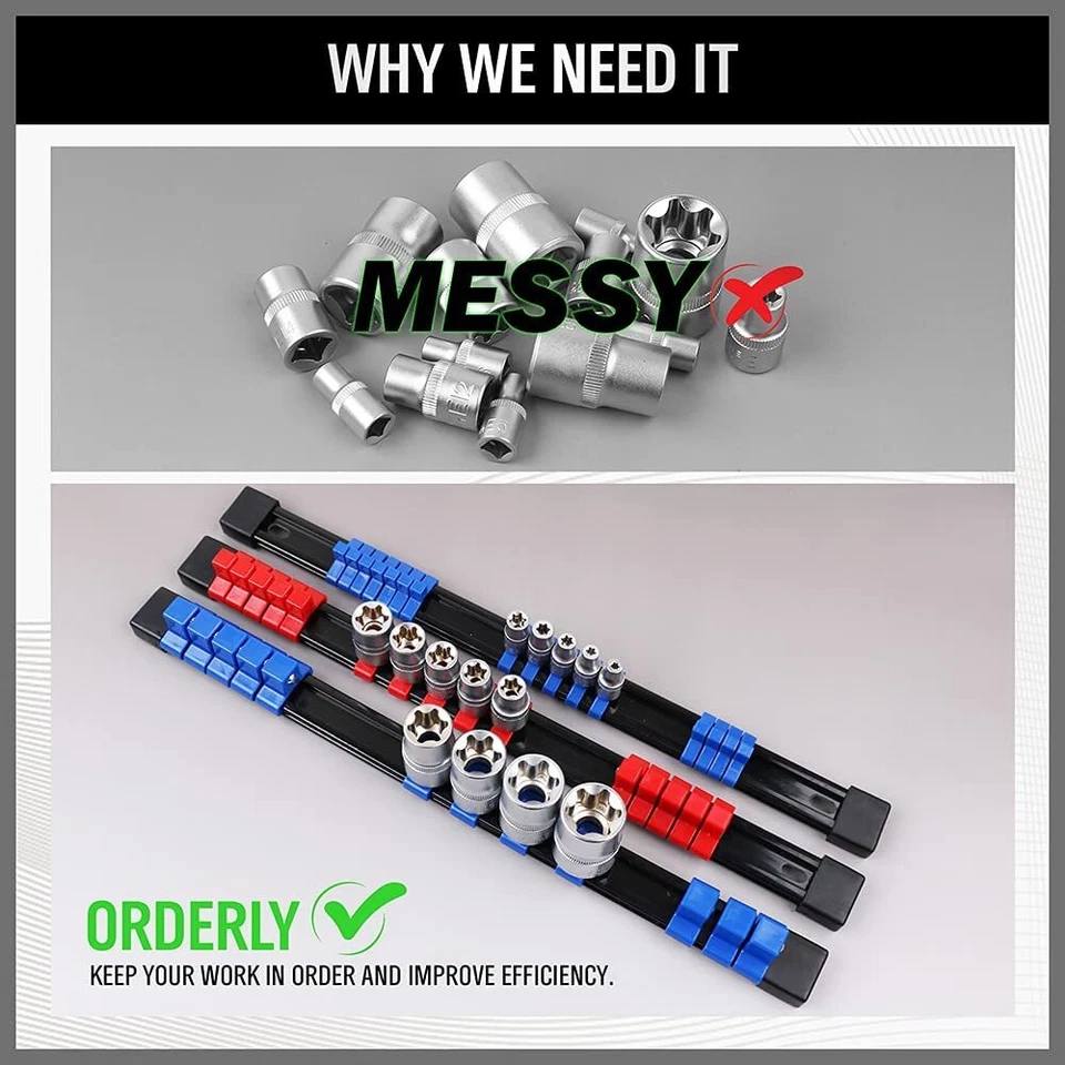 Versatile Socket Rail Organizer – This socket rail organizer tray set is the perfect storage solution for your 1/2", 3/8", and 1/4" sockets, keeping them organized and easily accessible in your garage, workshop, or toolbox. The set includes multiple rails, allowing for neat and categorized storage of your sockets by size.