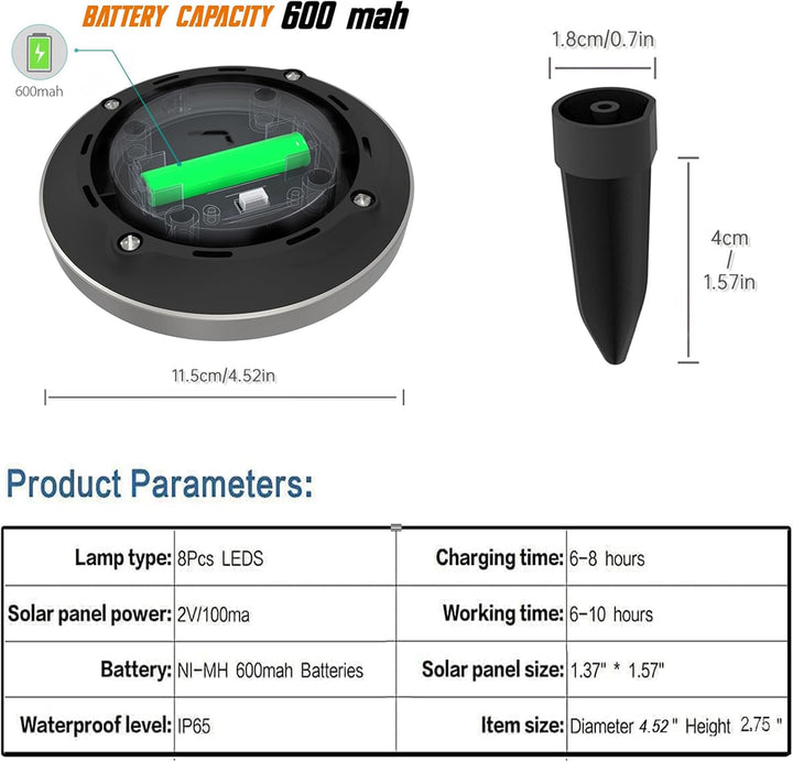 Illuminate your outdoor spaces beautifully with the 8 Pack Solar Ground Lights, designed to provide bright, energy-efficient lighting for your garden, lawn, walkway, or yard. Each solar light is equipped with 8 powerful LEDs and a 600mAh rechargeable battery, offering up to 10 hours of illumination after 6–8 hours of sunlight charging.