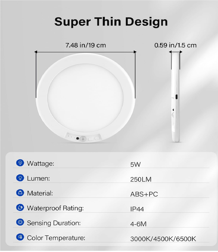Brighten dark areas in your home with the 7.5-inch Motion Sensor Ceiling Light, a wireless, battery-operated lighting solution ideal for hallways, toilets, garages, stairways, closets, basements, and more. Designed for easy installation without wiring, this ceiling light offers powerful illumination with 250 lumens and three selectable color temperatures—Warm White, Neutral White, and Cool White—allowing you to create the perfect lighting atmosphere for any space.