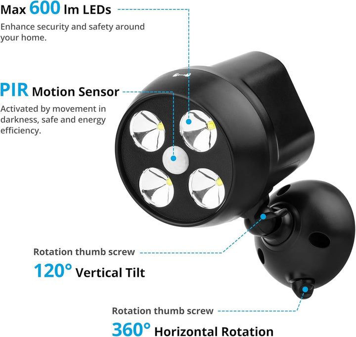 Light up your outdoor spaces effortlessly with this Battery Powered Outdoor LED Security Light, designed for powerful illumination and ultimate convenience. Featuring 4 ultra-bright 2W LEDs that produce up to 600 lumens, this weather-resistant wall light delivers reliable brightness to your garden, driveway, patio, or walkway.