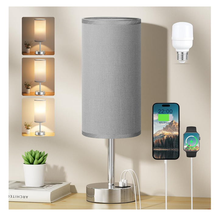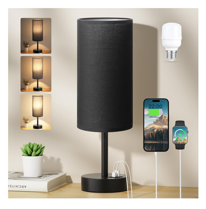 Bedside Table Lamp with Touch Control, USB A+C Charging, Dimmable Fabric Shade