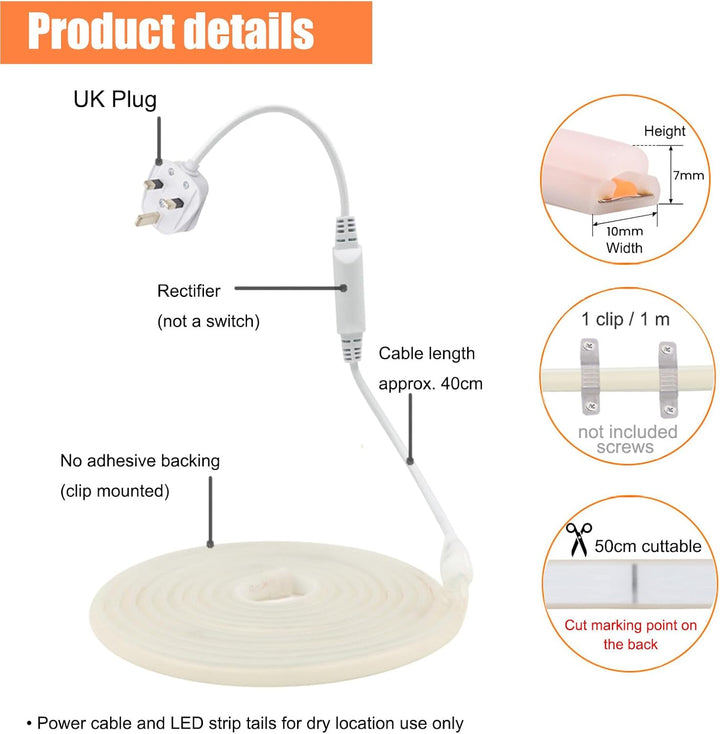 Illuminate your space with the Flexible COB Neon Light Strip, a premium 220V LED strip designed for both indoor and outdoor use. With 288 LEDs per meter, this high-density strip provides continuous, uniform lighting with no visible dark spots—perfect for creating ambient effects or accent lighting. Measuring 2 meters and cuttable every 50 cm, it offers versatility for customized installations. The strip features an IP65 waterproof rating, making it ideal for outdoor patios, kitchens, bathrooms, signage, or decorative borders. Built from durable modified silica gel, it ensures superior flexibility, heat resistance, and long lifespan. The included UK plug power supply ensures easy setup—simply plug and play. Available in Warm White, it delivers soft, cozy illumination for home, office, or commercial décor.