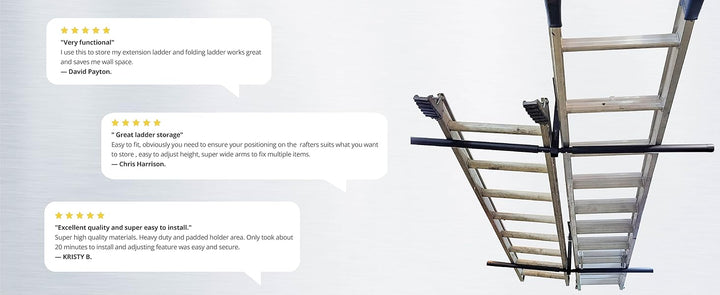 Patented Design: The exclusive patented design provides a reliable and secure way to store your ladders, keeping them off the floor and out of the way.