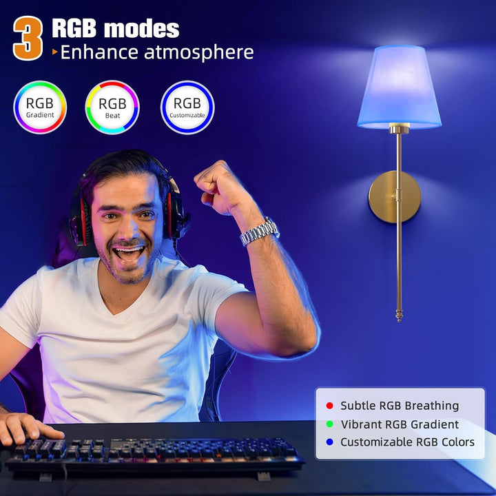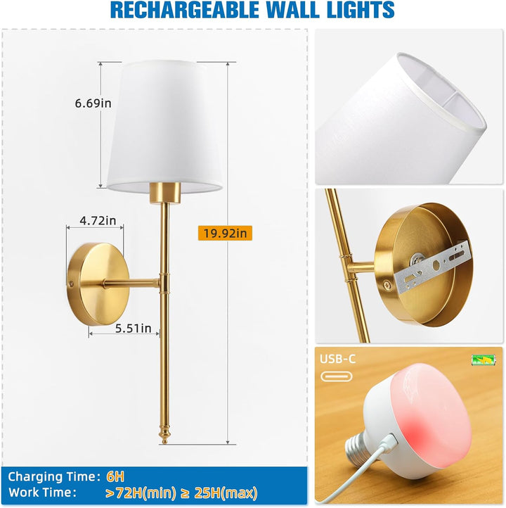 19.9-inch Rechargeable Gold Wall Light – Dimmable 9-Colour Battery Operated Lamp with Remote, 5200 mAh Battery, Nickel Finish, Fabric Shade