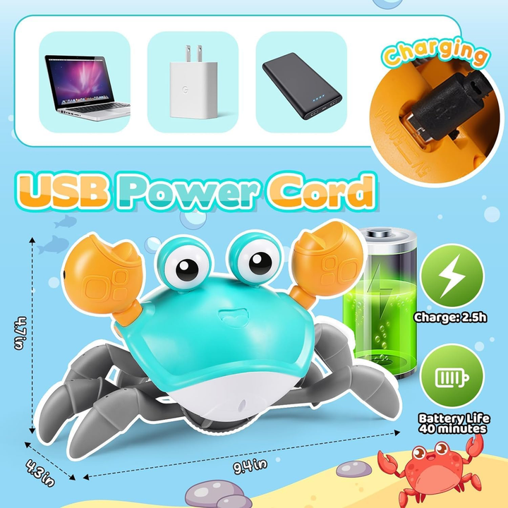 The Interactive Crawling Crab Toy is designed to keep babies and toddlers active, engaged and entertained through movement-based sensory play. This smart crab scuttles sideways, lights up and plays cheerful music to encourage babies to crawl, chase and develop early motor skills. Its motion sensor allows it to change direction when it encounters obstacles, making playtime dynamic and exciting.