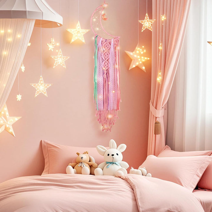 Elevate your space with the Koytoy Macrame Moon Dream Catcher, a beautifully handcrafted tapestry that blends bohemian charm with a warm, magical glow. Meticulously woven from 100% cotton rope and adorned with an elegant pearl and a shimmering moon pendant, this piece is more than just a wall hanging—it's a symbol of good wishes. Rooted in tradition, the dream catcher is believed to guard against nighttime troubles, ushering in peaceful dreams and positive energy for the new day. Complete with a delicate string of LED lights, it transforms into a dreamy focal point at night, casting a soft, ambient light perfect for creating a serene atmosphere. Ideal for decorating your bedroom, nursery, or living area, it also serves as a thoughtful and unique gift for housewarmings, weddings, Christmas, Ramadan, or any special occasion.