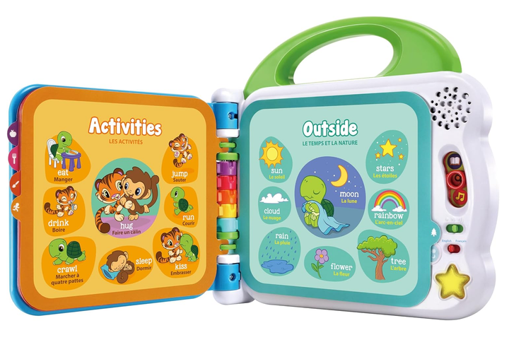 With simple touch-activated pages, children can tap pictures to hear words, sound effects, and fun learning phrases. The bilingual function allows easy switching between English and another language, helping toddlers build dual-language understanding from an early age.