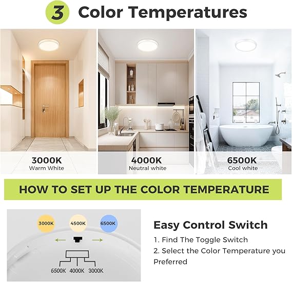 Upgrade your home lighting with this modern Round LED Ceiling Light featuring selectable 3000K, 4000K, and 6500K color temperatures for perfect ambiance in any room. Designed with an IP54 waterproof rating, this fixture is ideal for bathrooms, kitchens, and other moisture-prone areas. Its slim, flush-mount design blends seamlessly with both modern and traditional décor styles while delivering bright, energy-efficient illumination. Whether used in hallways, bedrooms, living rooms, or utility areas, this ceiling light provides long-lasting performance, uniform lighting, and effortless installation—making it a smart and stylish lighting solution for your home.