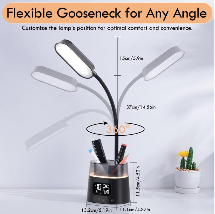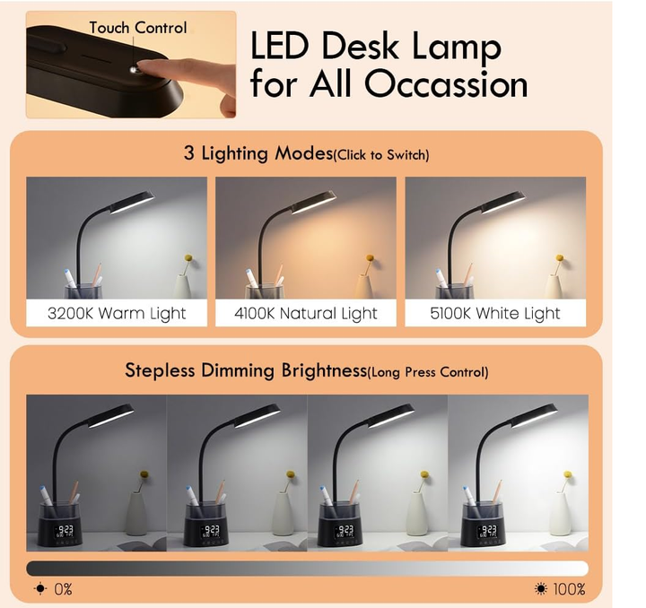 This LED Desk Lamp is a versatile and space-saving lighting solution designed for home offices, study desks, kids’ rooms, and college dorms. Featuring a combination of bright LED lighting, practical desk organisation, and modern digital functions, it creates an efficient and clutter-free workspace.