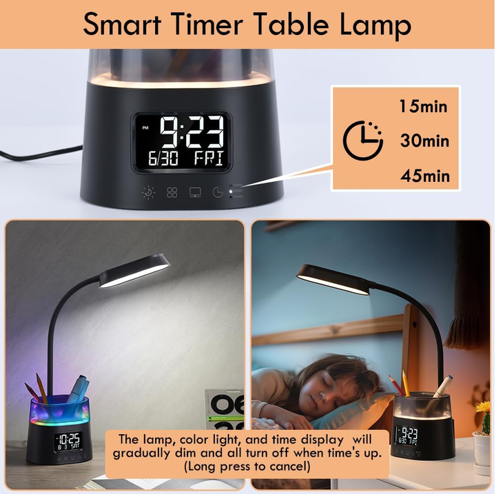 LED Desk Lamp with Pen Holder, Clock, USB Port and RGB Night Light for Study