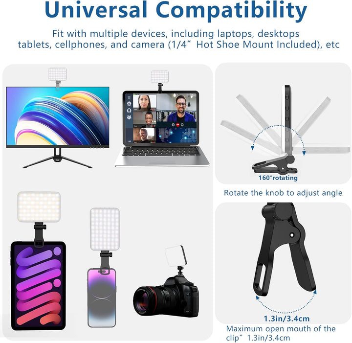 Equipped with a universal clip and camera tripod adapter, the light can be securely attached to phones, tablets, laptops, or mounted on a tripod for hands-free use. Its portable design allows you to take it anywhere, making it ideal for indoor or outdoor use, on-the-go content creation, or professional lighting setups.