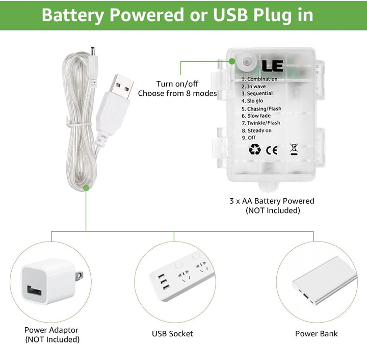 With two power options — USB plug or 3×AA batteries (not included) — you can easily use them indoors or outdoors without needing an outlet nearby. The 8 lighting modes (7 dynamic + 1 steady-on) allow you to choose from a variety of twinkling and fading effects to set the perfect mood.