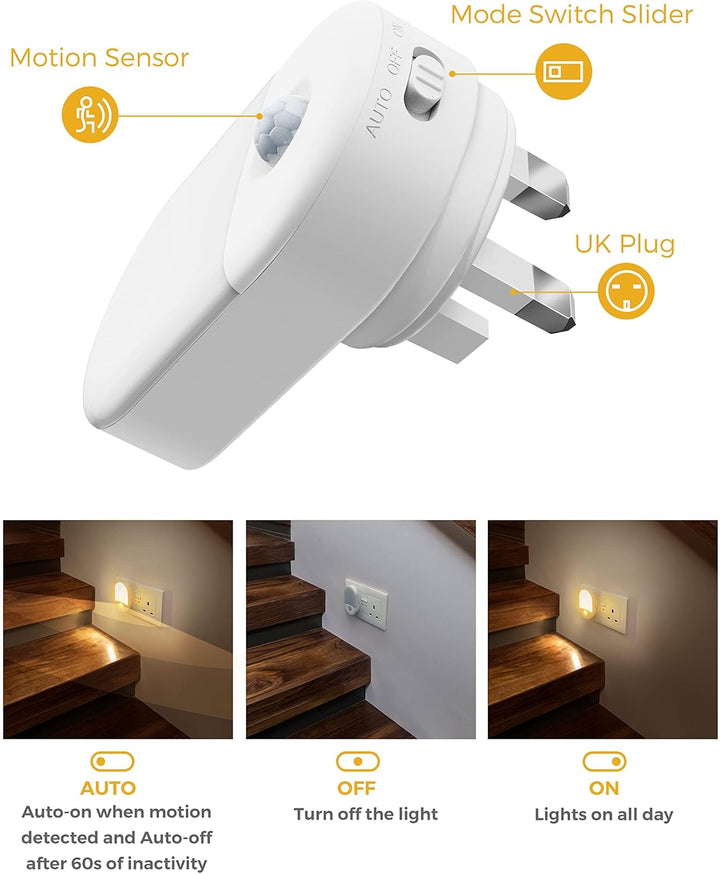 Featuring three intuitive lighting modes (ON / OFF / AUTO), this plug-in night light offers convenience and control. In AUTO mode, it detects motion within 3–5 meters at a 120° angle, automatically turning on in the dark and switching off after 60 seconds of no movement — ideal for nighttime navigation without disturbing others.
