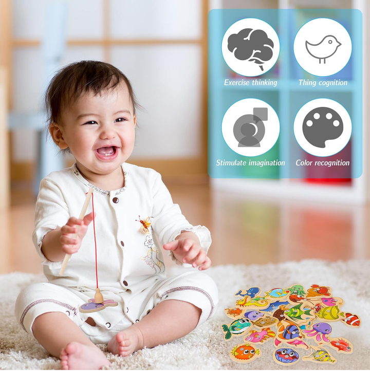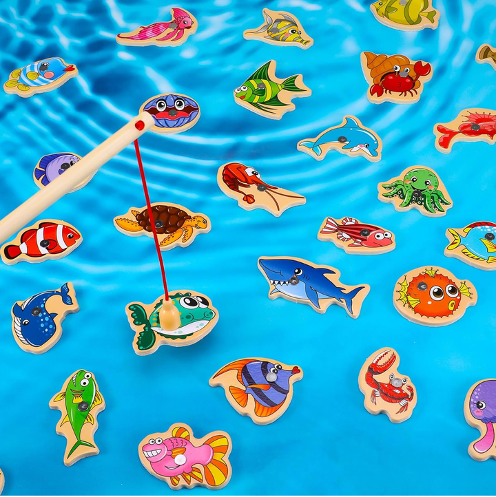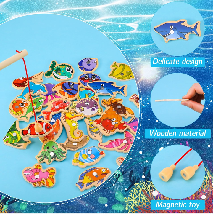 Magnetic Fishing Game Set, 33 pcs Wooden Ocean Animal Learning Toy for Kids