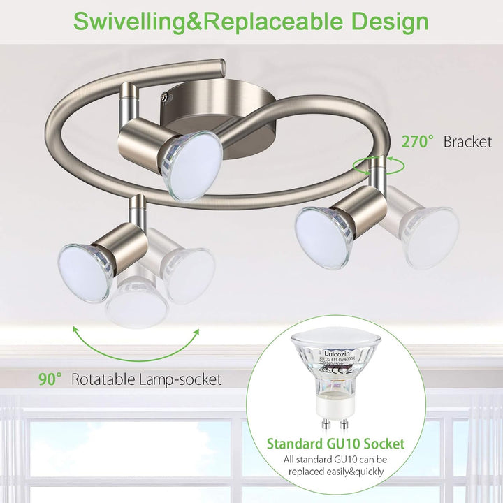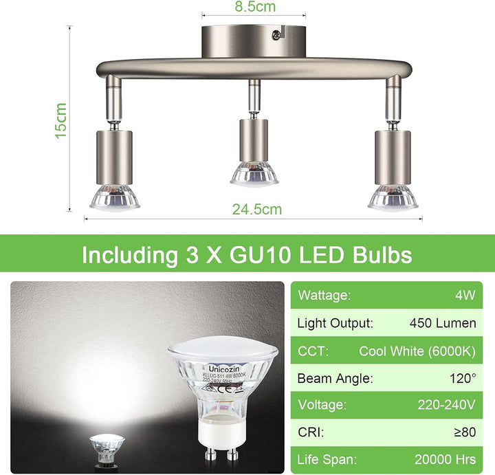 Modern 3-Way Rotatable LED Ceiling Spotlight | Matt Nickel Adjustable Light with GU10 Bulbs