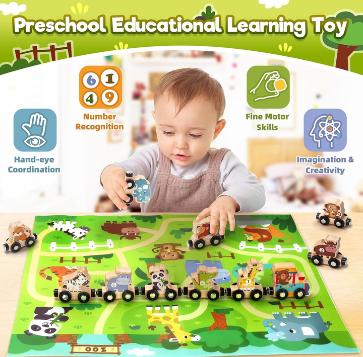 The smooth wooden pieces are crafted for small hands, helping toddlers build coordination, problem-solving skills, and creativity. Each train car connects easily with safe magnets, making it simple for young children to build their own train chain while learning about motion, animals, shapes, and basic sequencing. The vibrant farm-themed track mat adds extra play value, allowing children to explore routes, arrange animals, and create their own mini farm adventures.