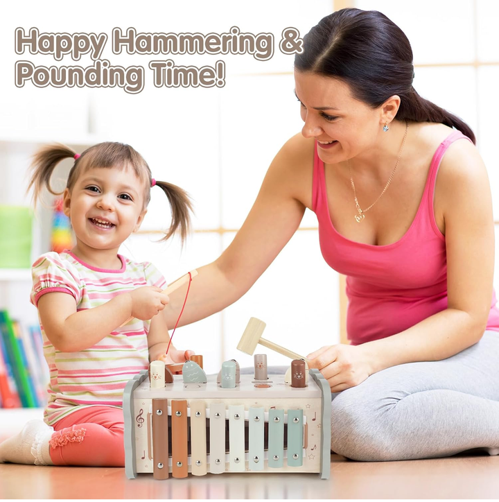 This Montessori Wooden Hammering and Xylophone Toy is a multifunctional learning set designed for boys and girls aged 1 to 3. It includes a pounding bench, colourful balls, a classic xylophone, and a magnetic fishing game, offering endless ways to play and learn. Toddlers can practise hand-eye coordination by hammering the balls, enjoy musical exploration with the xylophone, and improve focus and fine motor skills through magnetic fishing.