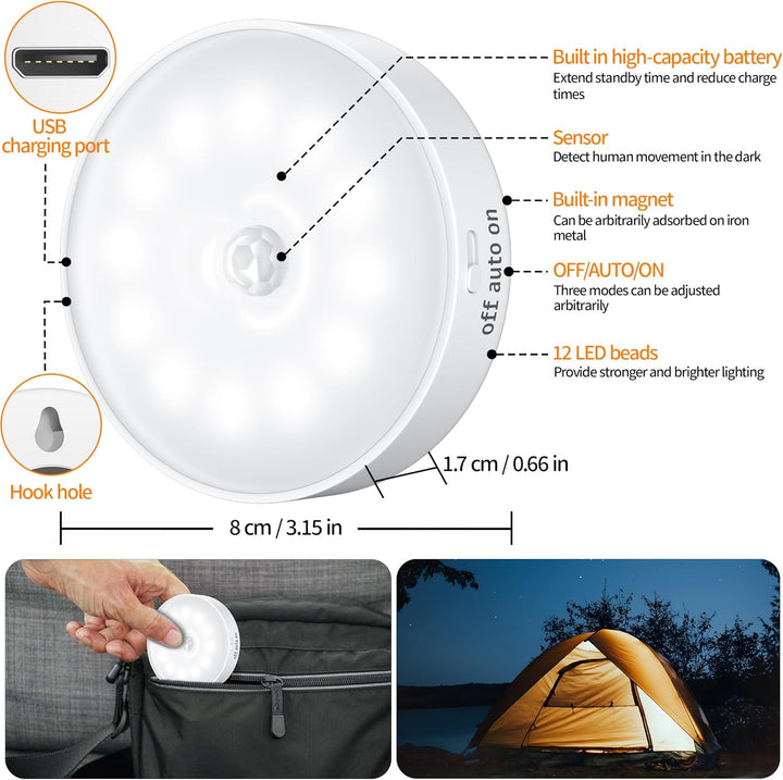 Upgrade your home lighting with this 6 Pack Motion Sensor Lights Indoor, designed to provide bright, energy-efficient illumination exactly where you need it. Each puck light features 12 upgraded LED lamp beads, producing brighter and more consistent light than standard 8-LED induction lights. The anti-glare panel ensures soft lighting that protects your eyes, making it ideal for bedrooms, kitchens, closets, and stairways.
