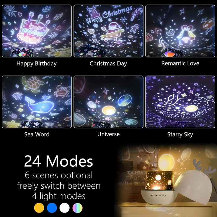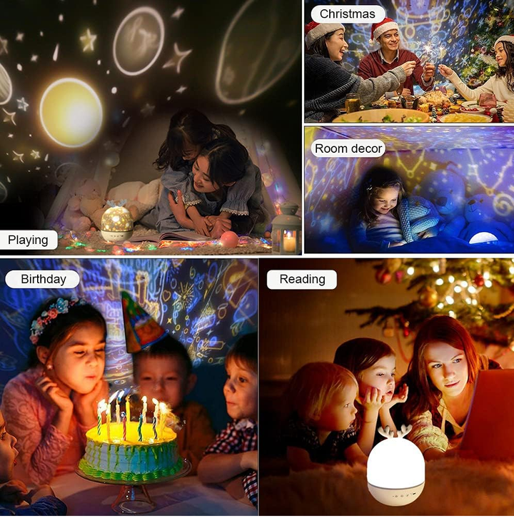 Create a magical bedtime experience with this Night Light Projector with Music, designed to entertain and soothe children. The projector features 6 interchangeable film discs that display stars, planets, and other captivating images across walls and ceilings. Its 360° rotating projection adds a dynamic effect, transforming any nursery or bedroom into a starry sky.