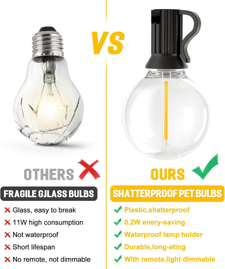 20M Decorative Lighting: 25 G40 bulbs + 2 spare bulbs included for extended use.