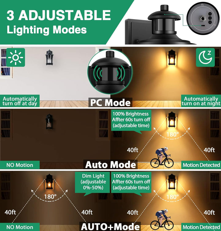 The advanced PIR motion sensor offers customizable detection range (up to 40ft) and 3 lighting modes for total flexibility. Whether you want constant soft glow at night or bright light upon motion detection, this fixture combines modern technology with classic design to deliver superior outdoor lighting all year round.