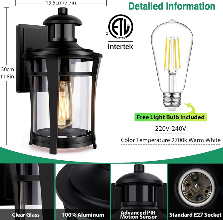 Bring style, safety, and convenience to your home exterior with this Outdoor Wall Light with PIR Motion Sensor and Dusk-to-Dawn function. Crafted from durable aluminum with clear seeded glass panels, this elegant wall lantern provides bright, dependable illumination for doorways, garages, patios, and gardens — while automatically adjusting to ambient light and motion.