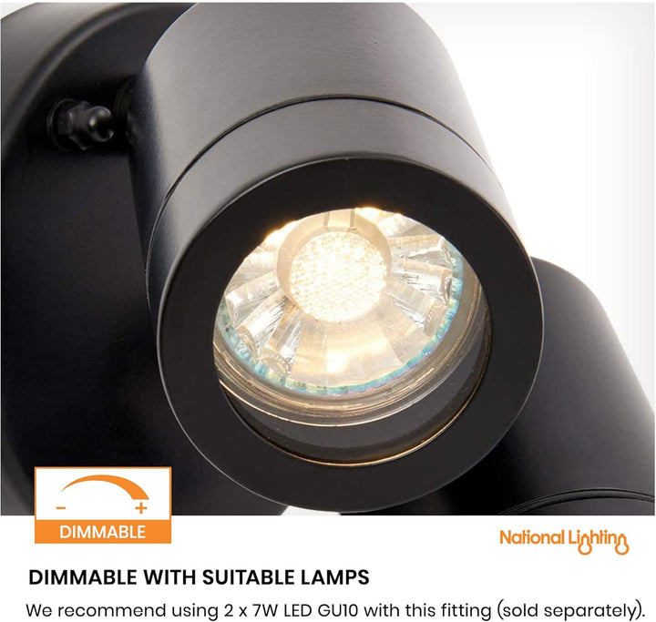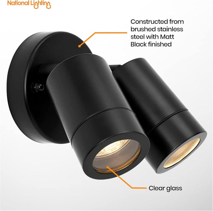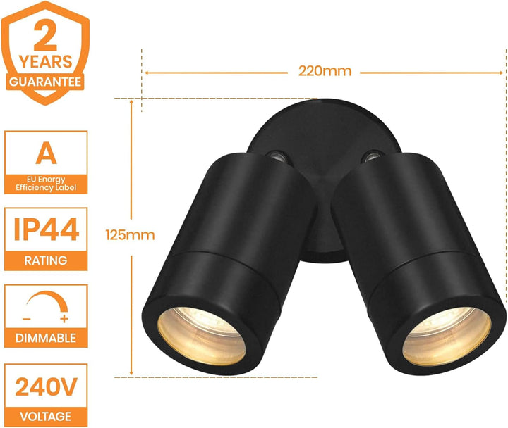 The twin adjustable heads provide precise lighting control, featuring 220° horizontal rotation and 90° vertical tilt, making it easy to focus light exactly where you need it. Fully dimmable with suitable bulbs, these spotlights are perfect for creating ambiance or adding security lighting.