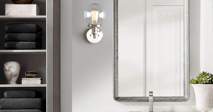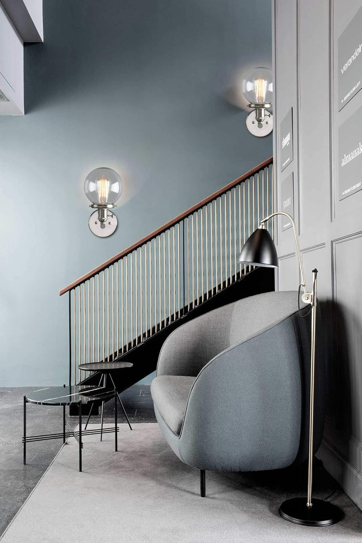 A retro brushed finish paired with a clear glass globe shade gives this wall sconce a sophisticated, timeless look that complements both classic and modern interiors. -