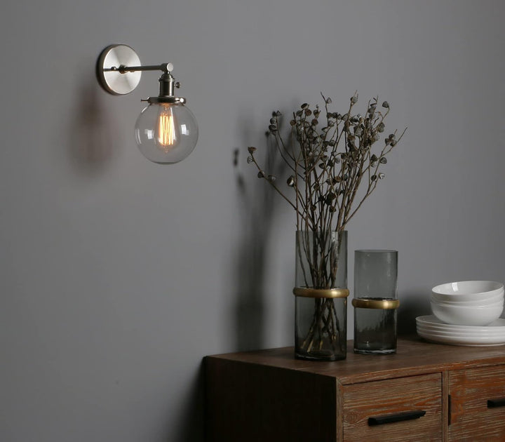 Add timeless elegance and industrial charm to your home with the Phansthy Retro Style Industrial Wall Light Fixture. Featuring a beautifully hand-blown glass globe shade and a brushed metal finish, this vintage-inspired wall sconce blends modern craftsmanship with classic design — perfect for bedrooms, hallways, dining rooms, and vanity areas.