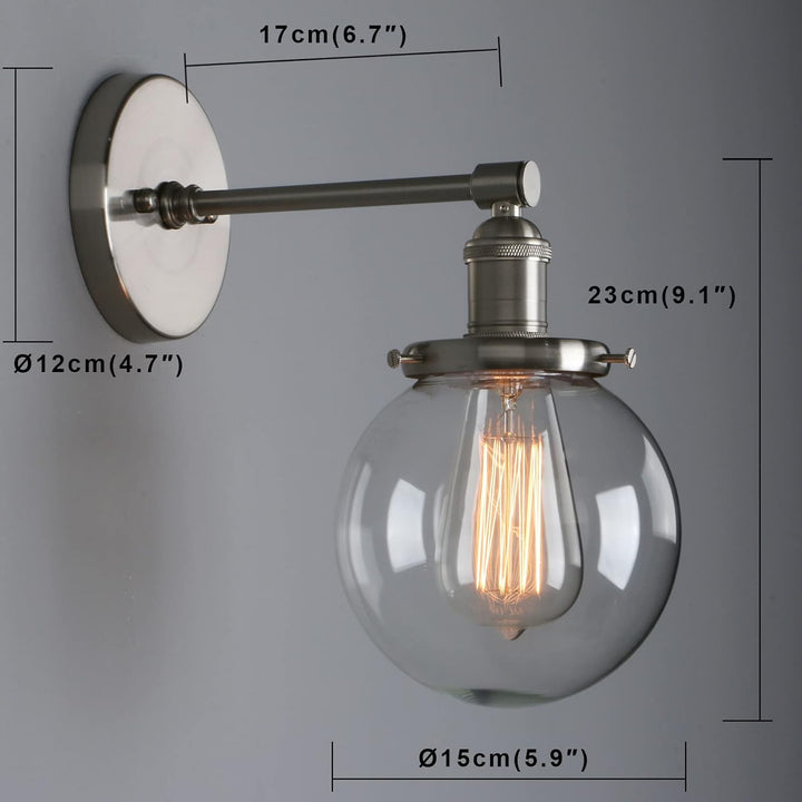 Phansthy Retro Industrial Wall Light – Brushed Metal Sconce with Hand-Blown Glass Globe Shade, E27 Socket, Twist Switch, Adjustable Angle
