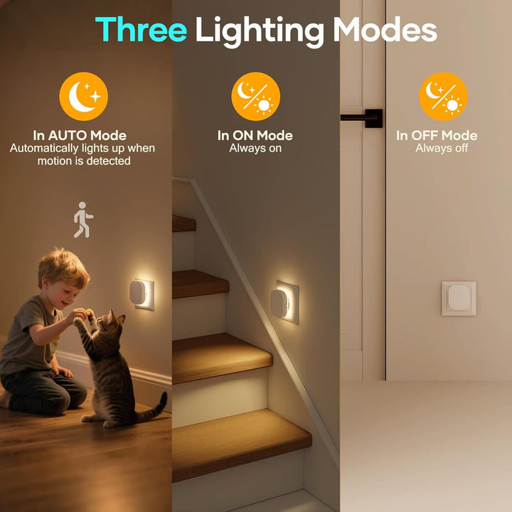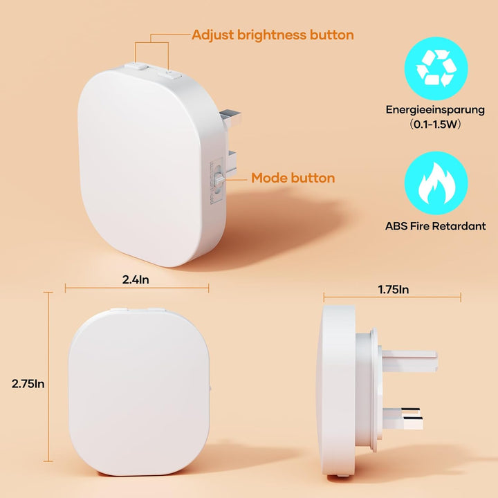 Illuminate your home with the 2 Pack Backlit Plug-in Night Lights, designed for ultimate convenience, comfort, and energy efficiency. Featuring adjustable brightness from 0.5–70 lumens, these night lights can be tailored to your ideal lighting level with a simple press and hold of the “±” button. Equipped with three lighting modes (Auto/On/Off) and a motion & dusk-to-dawn sensor, the light turns on automatically when movement is detected in low-light conditions and switches off after 60 seconds of inactivity.
