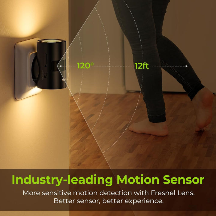 Brighten your home with the 2 Pack LED Plug-in Motion Sensor Night Lights, designed to combine smart sensing, customizable brightness, and energy efficiency. Each light features a Fresnel motion lens that detects movement within 3–5 meters and a 120° wide angle, automatically turning on when motion is detected in low-light conditions and switching off after 60 seconds of inactivity.