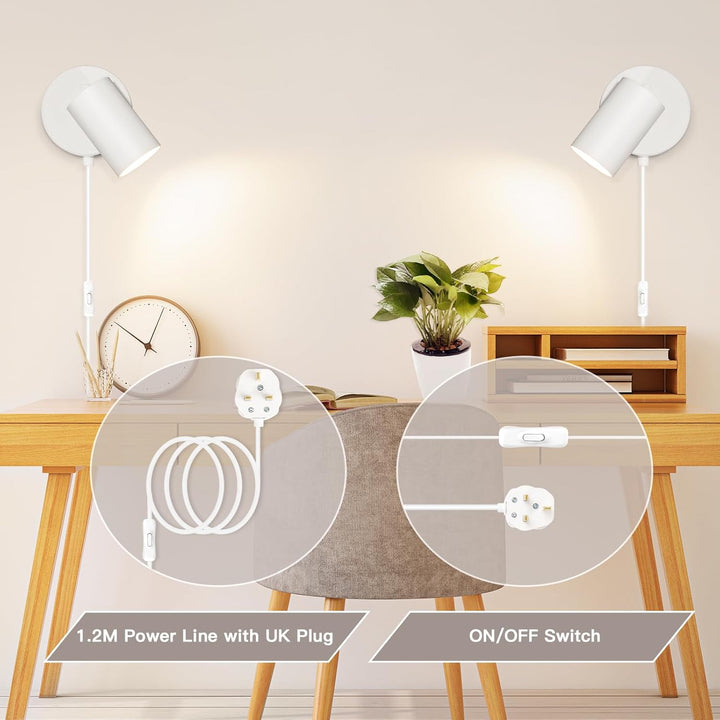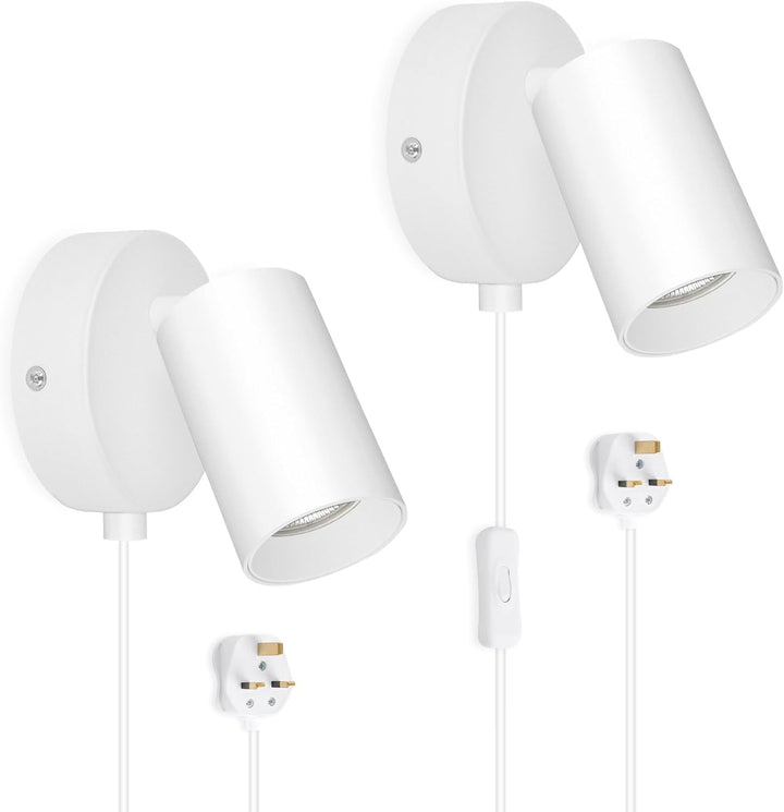 Illuminate your space with style and convenience using this 2 Pack White Plug-in GU10 Wall Light Set. Designed for flexibility and modern interiors, these lights feature a 350° horizontal rotation and 90° vertical tilt, allowing you to adjust the lighting direction effortlessly — perfect for reading, working, or accent lighting.
