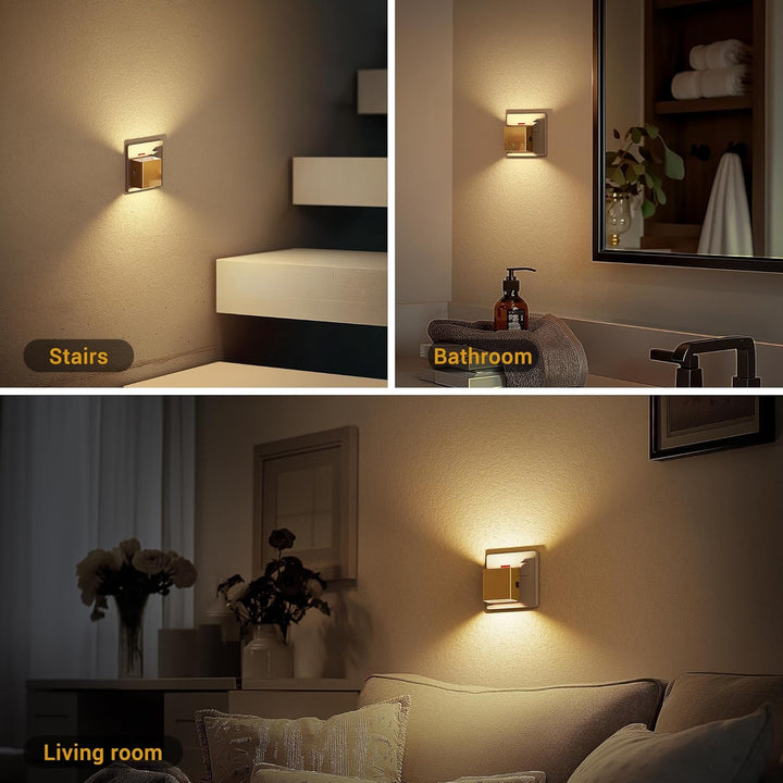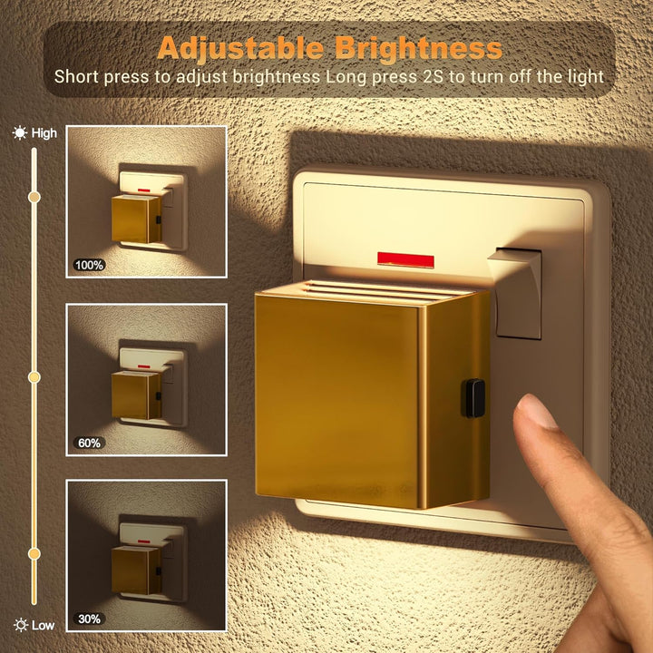 Enhance your home lighting with the Gold LED Plug-in Night Light (2 Pack) — a stylish and intelligent nightlight designed to provide warm 3000K illumination while saving energy. Featuring 3 adjustable brightness levels (30/60/100 lumens) and a memory function, it remembers your preferred brightness every time you switch it on.