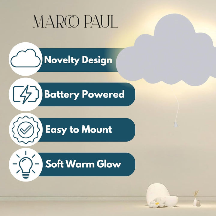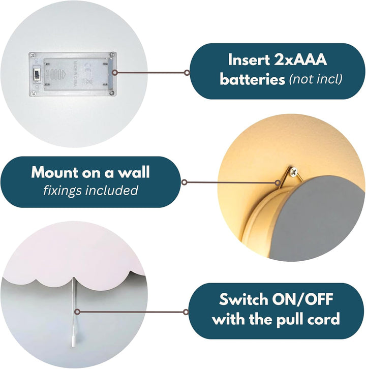 The light features a corded on/off switch for easy operation and is battery powered (2 × AAA, not included) — no wiring, plugs, or electrician needed. The hook on the back makes wall mounting quick and simple, while its lightweight design allows easy repositioning.