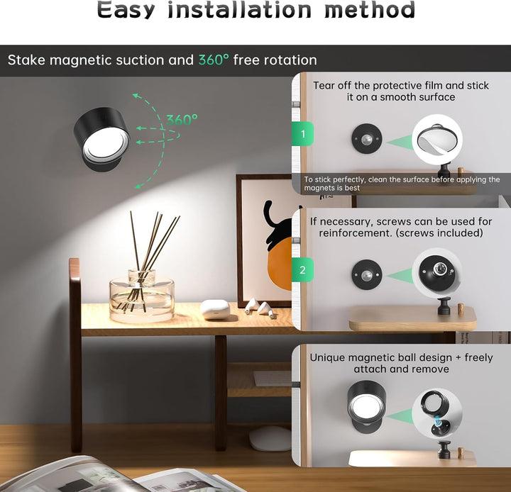 Installation is quick and tool-free with 3M adhesive magnetic mounts, or you can use the included screw mounting option for a permanent setup. Control your lighting with ease using the wireless remote, featuring 3 color modes (Warm, Natural, Cool) and stepless dimming to match any atmosphere.