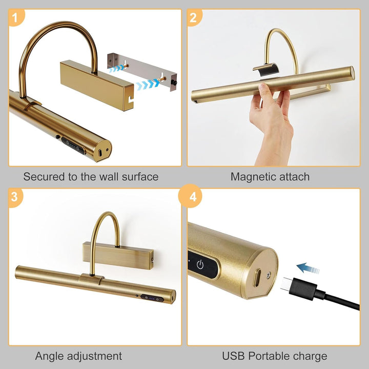 Illuminate your favorite artwork, photographs, or wall décor with this elegant Antique Brass Rechargeable Picture Light, designed to combine classic style with modern technology. Featuring a built-in 4000mAh rechargeable battery, this magnetic wall light offers up to 8 hours of continuous use and fully charges in just 4 hours via USB.